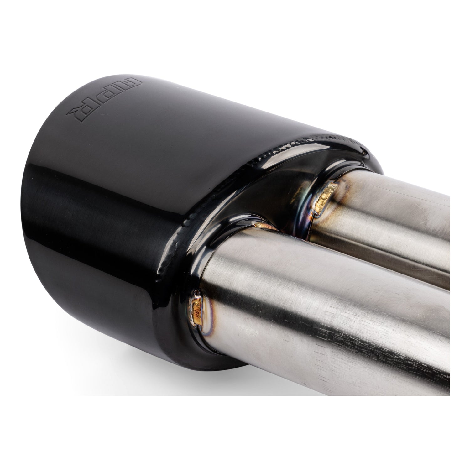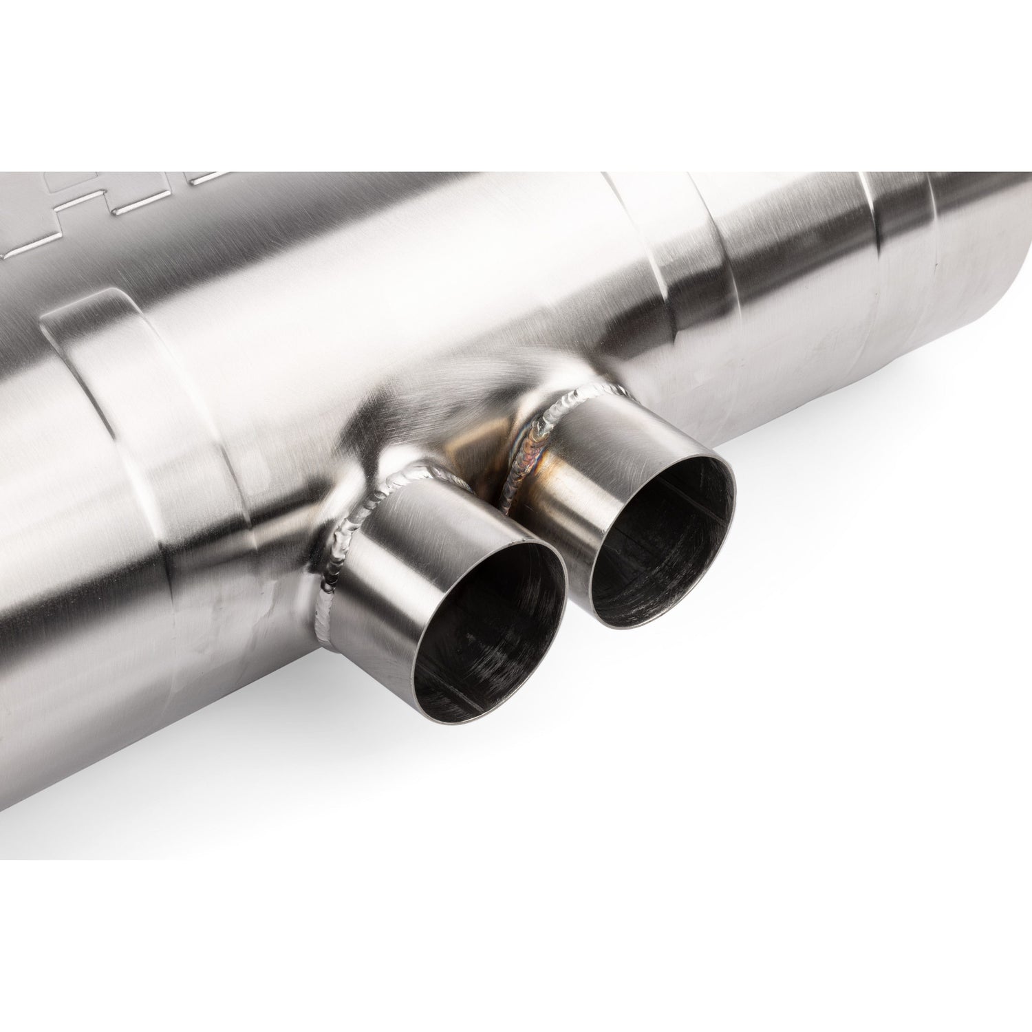 The factory exhaust system starts life as a dual pipe setup but then converges to a single pipe before entering a suitcase style muffler. Our system uses dual 63.5mm piping with no mid mufflers or resonators, and continues all the way to our large sound absorption rear muffler. The cross sectional area of our dual setup is 26% larger than stock! There the system splits to a quad 63.5mm design. Internally the valved path is straight through with no muffling, while the unvalved path is perforated for sound level reduction. This exits the rear into a pair of 170x112mm diamond black exhaust tips that look menacing from the rear of the vehicle.