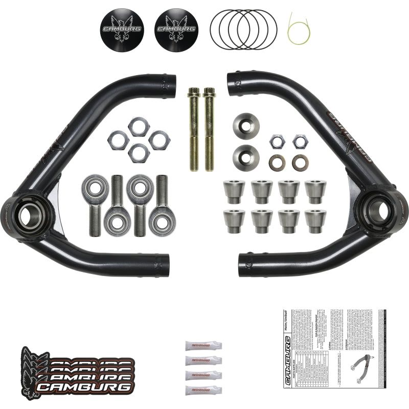 Our Camburg upper arms are designed to address the limitations of stock upper arms when lifting your truck. By replacing the stock ball-joint with a uniball bearing, we improve wheel travel and durability under extreme conditions. We also enhance the vehicle's alignment and driving characteristics by adjusting the camber curve and incorporating larger and stronger FK 7/8" chromoly heim joints for additional camber and caster adjustment. The billet aluminum cover on top of the uniball prevents dirt and contaminants from entering. Our arms are meticulously designed using CAD/CAM engineering software and manufactured in-house with precision CNC laser cutting, bending, and MIG welding. They are then sandblasted and powder-coated for a durable finish. Our machined parts, including the uniball mis-alignment spacers, are made from heat-treated stainless steel in our CNC machine shop. The arms come with all necessary hardware and are designed for 1-2.5" of lift. They are specifically designed for ZR2 models and are made in the USA.