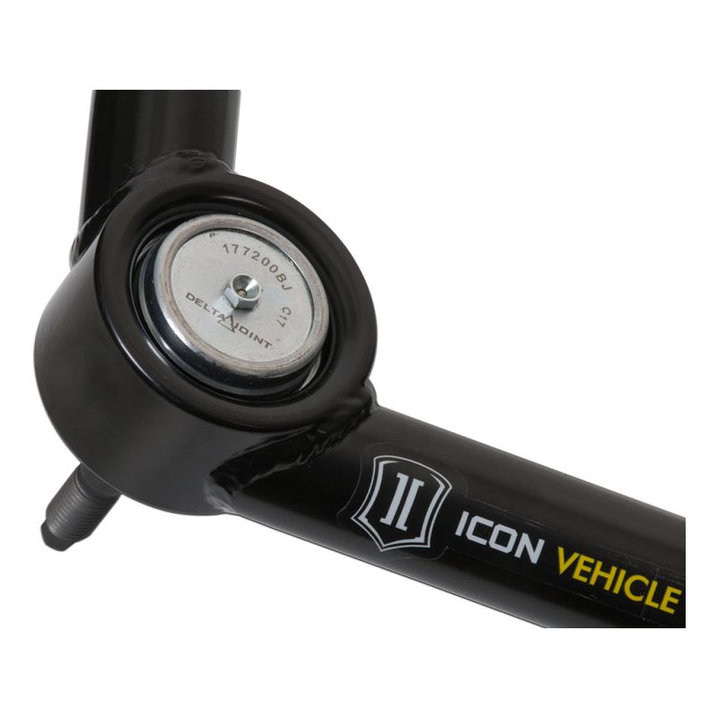 These upper control arms feature ICON's patented Delta Joint. The Delta Joint is a heavy duty high angle ball joint that combines the durability of a ball joint with the performance characteristics of a traditional uniball. While the industry standard uniball does a great job of allowing the control arms of a vehicle to articulate with little bind, they do have an inherent weakness that leaves more to be desired when used in a daily driven application - exposure to the elements. The Delta Joint features a zinc plated housing providing the first layer of corrosion resistance, while a tough grease seal keeps potentially harmful elements out of the inner workings of the joint. Metal on metal construction and a greasable design increase the longevity of the Delta Joint while at the same time allowing for noise-free operation. What makes the Delta Joint unique is that it brings the best of both worlds to ICON upper control arms with features that make it more robust than a uniball, and at the same time capable of greater angularity than a typical ball joint.