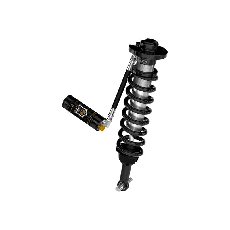 ICON Vehicle Dynamics V.S. Series 2.5” coilover shocks are an incredible upgrade for the front end of 2021-2024 Ford F-150 Tremor and F-150 4WD trucks equipped with ICON's Front Knuckle Kit. These coilovers feature an application specific length for F-150 Tremor or other F-150 sub-models equipped with ICON’s Front Knuckle Kit, allowing the most wheel travel possible as well as a taller lift height range than other ICON coilover options. ICON’s Vehicle-specific valving provides a sport tuned feel on and off-road while 2.5-3” of lift height adjustability on F-150 Tremor or 3.5-4.5” of lift height adjustability on other F-150 sub-models allow the use of larger, more aggressive wheel and tire combinations. The larger 2.5” shock body and increased piston area over stock components provides improved damping ability and outstanding ride characteristics across varying types of terrain. Remote reservoirs greatly increase shock oil volume and heat dissipation surface area to resist overheating and cavitation under hard use, which can lead to damper fade. ICON's exclusive Compression Damping Control Valves are included for precisely dialing in your suspension performance. CDCV controls fluid flow under compression, allowing you to achieve the perfect tune whether driving on the street, slow-crawling through the rocks or mobbing across the desert at full throttle. When paired with ICON rear 2.0 Aluminum Series or 2.5 Aluminum Series shocks, vehicle control will be balanced front to rear, resulting in the best overall driving experience for your F-150.