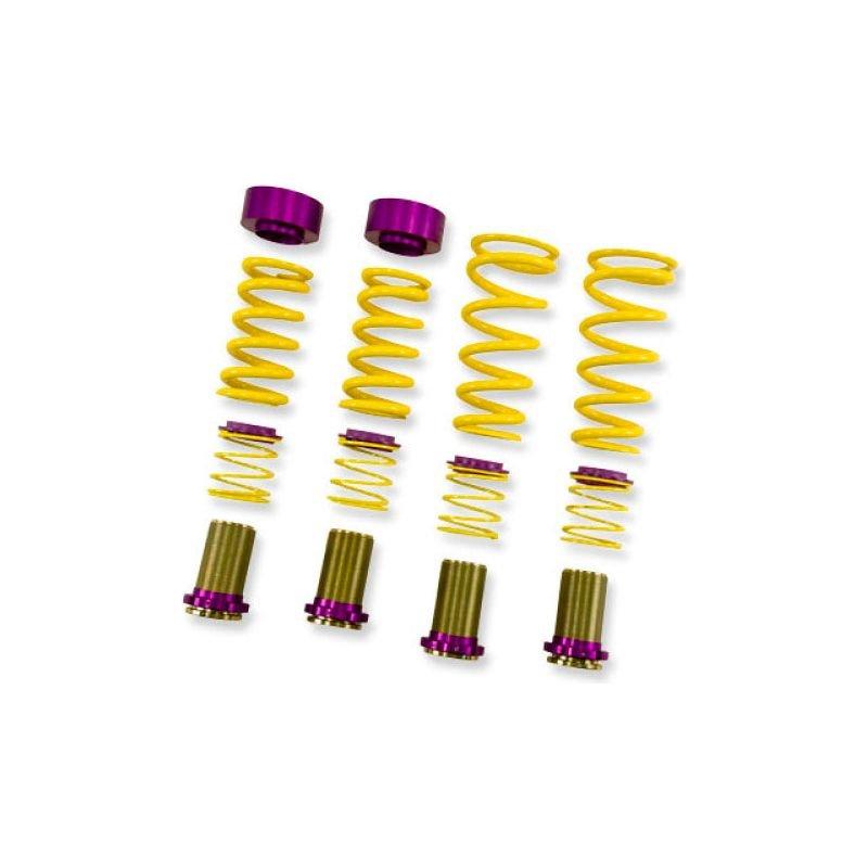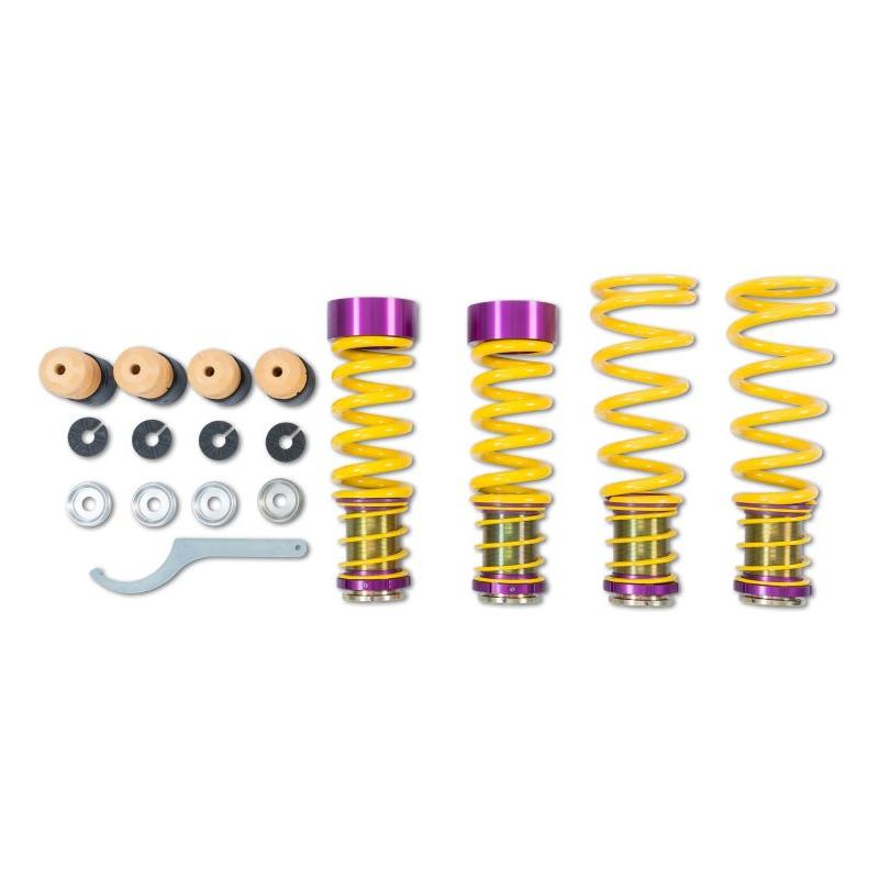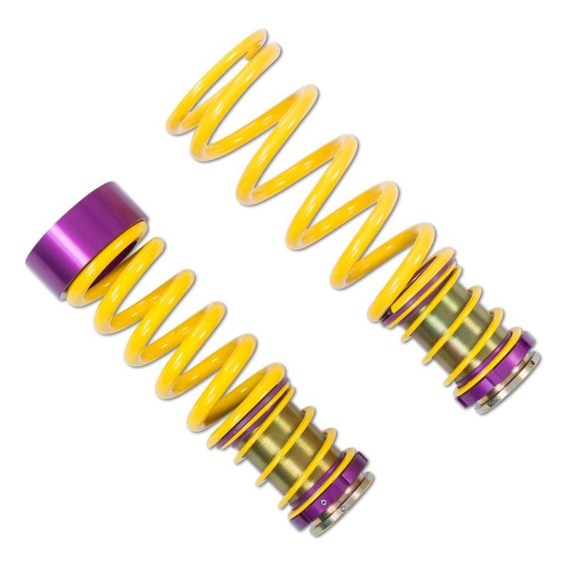 KW (H.A.S) Height Adjustable Spring kits are a great alternative to conventional lowering springs. You are no longer stuck with a fixed lowering height. KW H.A.S. systems allow you to adjust the vehicle ride height with the KW height adjuster even after the kit has been installed. Your vehicle not only gets a more dynamic look, but also the steering behavior and response of the standard dampers becomes more agile. All driver assistance systems and comfort features of a factory adaptive or electronic suspension remain operational and work harmoniously with our vehicle specific spring set up. KW uses high-quality springs made of chrome-silicon steel with spring rates designed specifically for each respective OE suspension damper and wheel load. KW's expertise and engineering ensure the spring rates will pair perfectly with the different damper characteristics of your factory adaptive electronic suspension. Along with the use of high quality materials and the included KW ride height Adjustment -echanisms, our KW H.A.S. kits always includes the vehicle-specific bump stops with dust protection system to protect your factory suspension against wear & tear caused by road grime and debris. Similar to a coilover suspension, the KW H.A.S kit allow a continuous adjustable ride height within a tested range, something not possible with conventional lowering springs. The dust protection elements and spring perches included in the delivery, when applicable, are always adjusted to the maximum technically possible lowering, typically limited by the factory dampers. With KW height adjustable springs, a sporty and harmonious driving behavior can be achieved without the driving dynamics of performance-oriented vehicles suffering. As with all KW suspension products our engineers develop vehicle specific parameters and spring specifications which undergo comprehensive testing on the Nurburgring Nordschleife and in our KW 7-post Driving Dynamic Test Center.